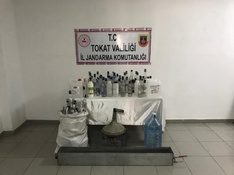 Adreste arama yapan ekipler, 45 litre kaçak alkollü içki, 20 litre etil alkol, 2 litre anason ve alkol damıtılmasında kullanılan düzenek buldu.