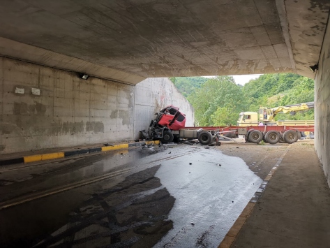 Viyadük altındaki beton duvara çarparak durabilen tırın sürücüsü D.A.K. ile yanındaki M.A. yaralandı.
