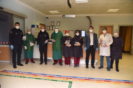 Trabzon İl Emniyet Müdürü Metin Alper'in talimatlarıyla polis ekipleri, Karadeniz Teknik Üniversitesi Farabi Hastanesi, 112 Acil Servis ile Vefa Sosyal Destek Grubu çalışanlarını ziyaret etti.