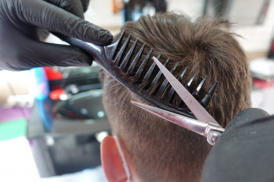 Önceden randevu alınması yoluyla sırası gelen müşteriler berber koltuğuna oturdu. Hem berberler hem de müşterilerin maske taktığı, bazı berberlerin ise siperli maske ile kendilerini koruduğu görüldü.