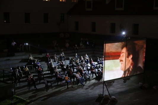Kent Müzesi bahçesinde yeni tip koronavirüs (Kovid-19) tedbirleri kapsamında sosyal mesafe kuralına uygun yerleştirilen sandalyelerde maske takarak oturan vatandaşlar, "Selvi Boylum Al Yazmalım" filmini beyaz perdede izledi.