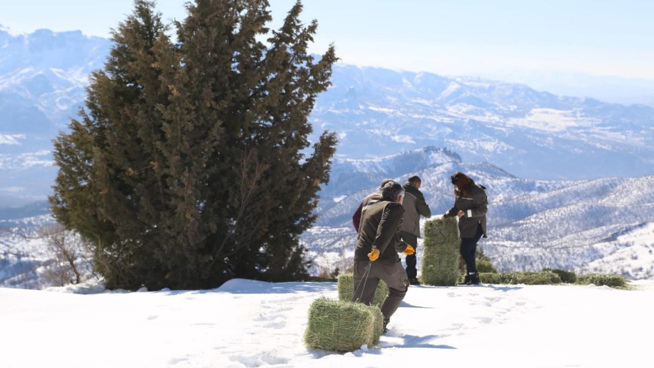 Çalışma kapsamında ekipler, yaban hayvanların yoğun olarak bulunduğu karlı dağlara çıkarak çeşitli noktalara 2 ton yem bırakıldı.