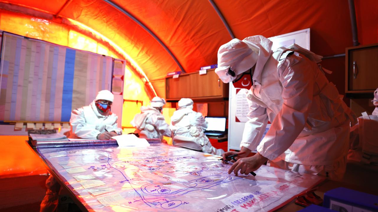 Daha sonra olası kimyasal bir saldırıya karşı dezenfekte görevi yapacak mobil timlerin tanıtıldığı tatbikatta, mobil yemekhane, çamaşırhane ve bulaşıkhaneler gazetecilere gezdirildi.