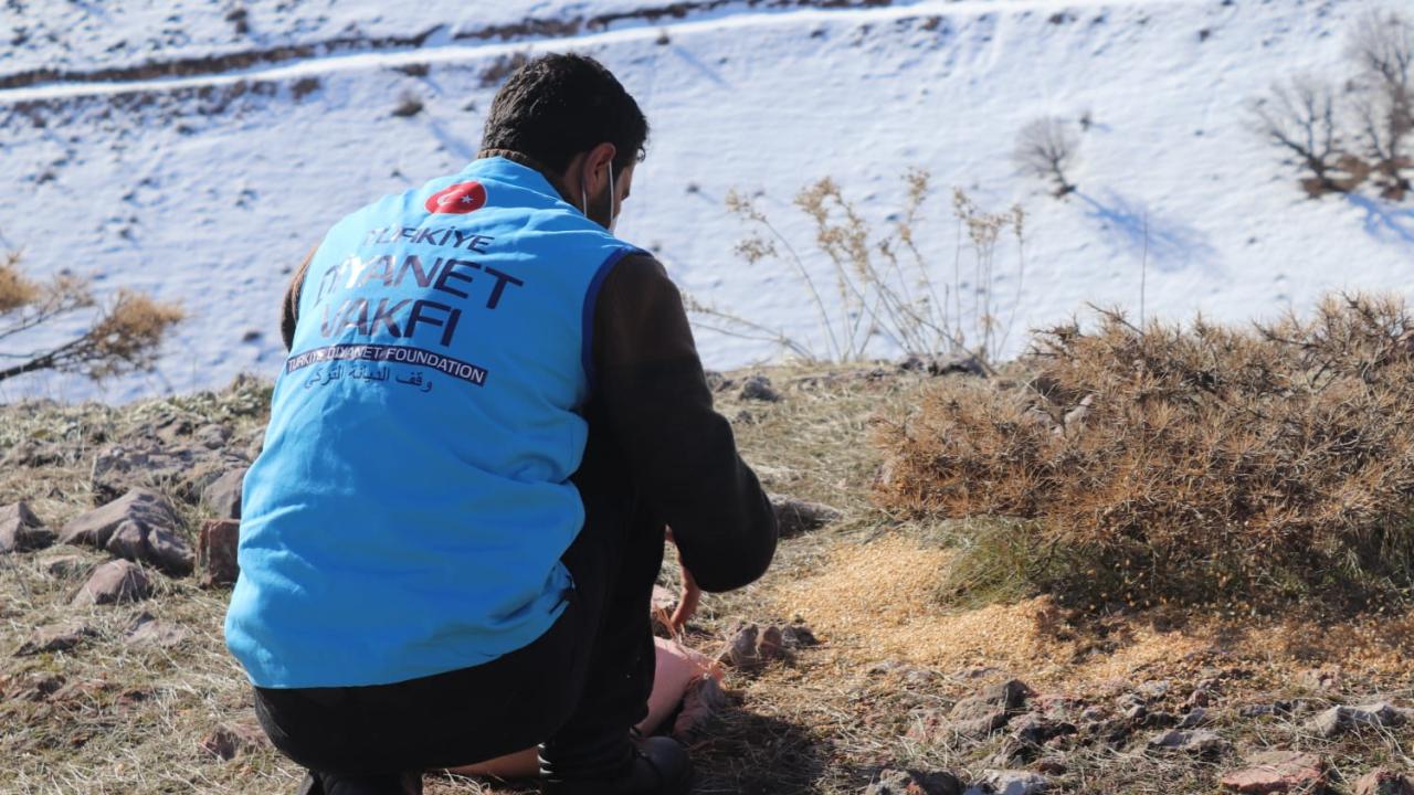 Türkiye Diyanet Vakfı Gönüllüsü Muhammed Ballı ve ailesi, Çelikhan ilçesi Mezar Dağı bölgesindeki yaban hayvanların yemlenmesi için çalışma başlattı.