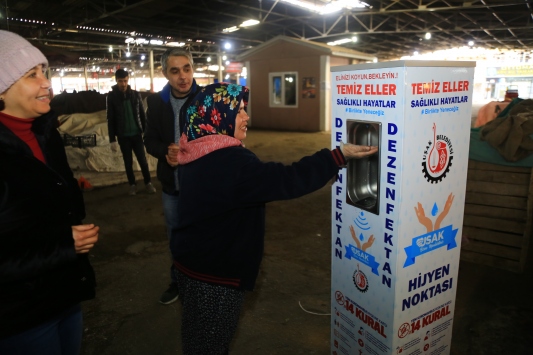 Uşak Beledesi, otobüs durakları, işçi servisi noktaları ve pazar yerleri başta olmak üzere kentte 25 noktada, dezenfektanları, Uşaklıların hizmetine sunuldu.