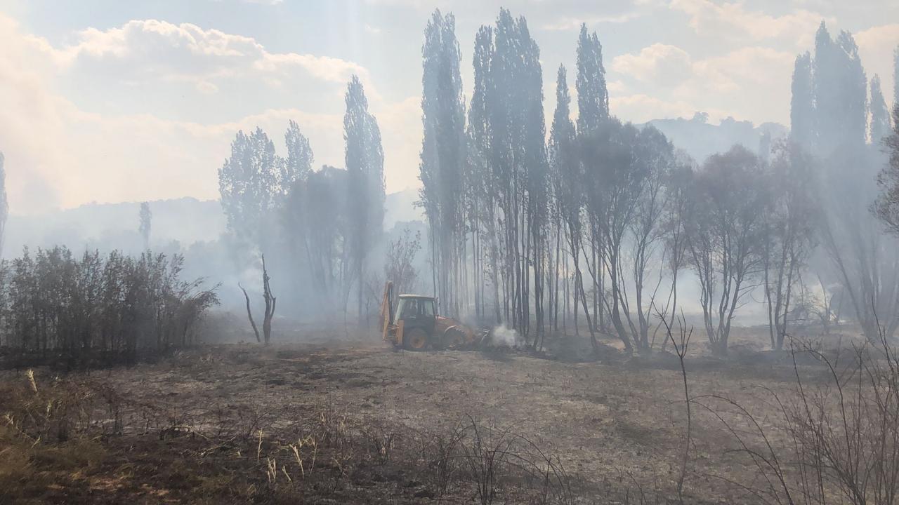 Rüzgarın da etkisiyle geniş alana yayılan yangını söndürme çalışmalarına helikopterlerle destek veriliyor.