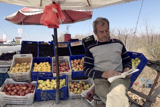 Sultandağı ilçesindeki bahçesinde yetiştirdiği meyveleri, yol üzerinde, şehirlerarası yolculuk yapan vatandaşlara satan 53 yaşındaki Özçelebi, bir günlük mesaisinin büyük kısmını kitap okuyarak geçiriyor.