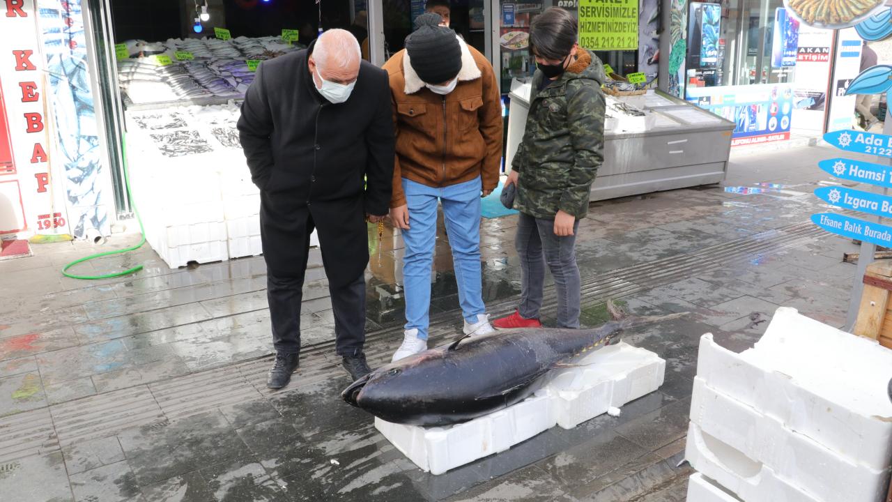 Sarraflar Caddesi'nde balıkçı tezgahında sergilenen 75 kiloluk orkinosu gören vatandaşlar, yakından inceleyip fotoğraf çektirdi.