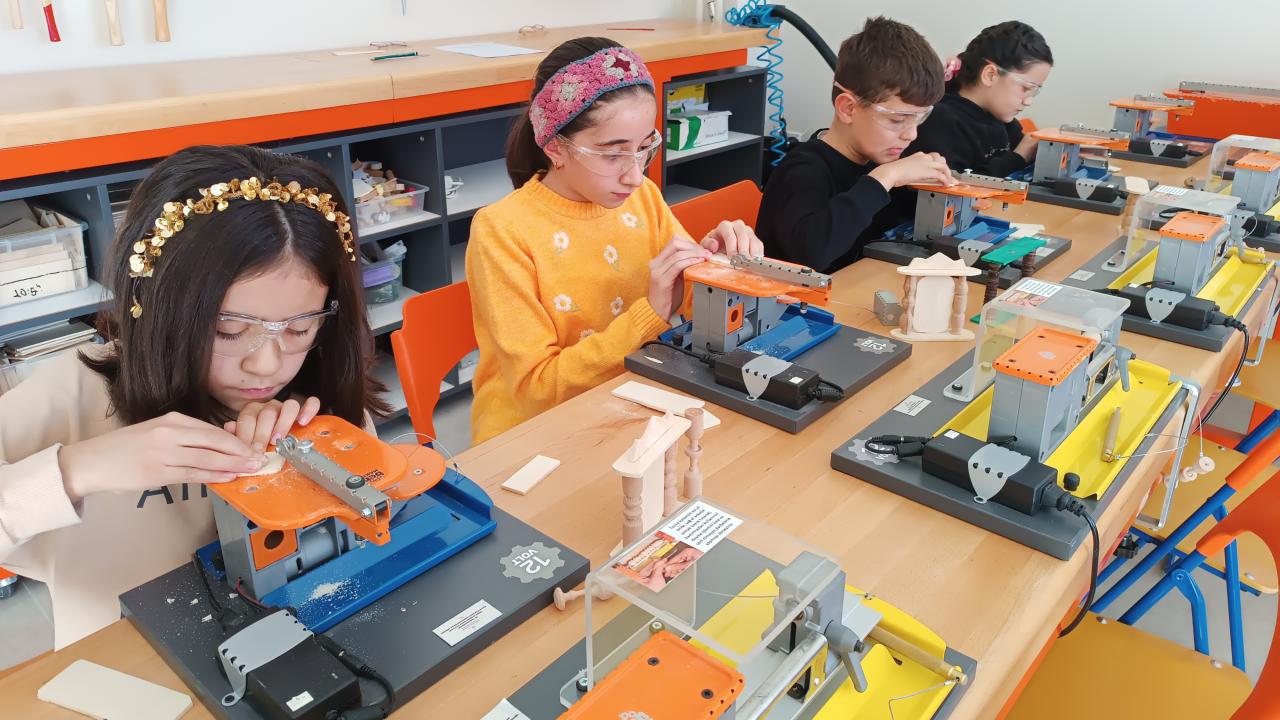 Öğretmenleriyle tasarım yaptıktan sonra tam güvenlikli mini tezgahlarda ahşabı biçimlendiren öğrenciler, kestikleri parçaları birleştirerek oyuncağa dönüştürüyor.