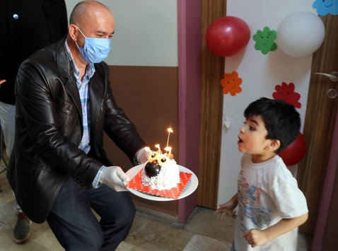 Ailesiyle kaldığı odanın çalınan kapısını açan minik Bertan, KYK personelinin elinde üzerinde mumlar yanan pastayı görünce çok şaşırarak sevincini gösterdi.