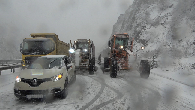 Aniden bastıran kar yağışı nedeniyle araçlar yolda kalırken, ekipler yolu ulaşıma açmak için çalışmalarını sürdürüyor.