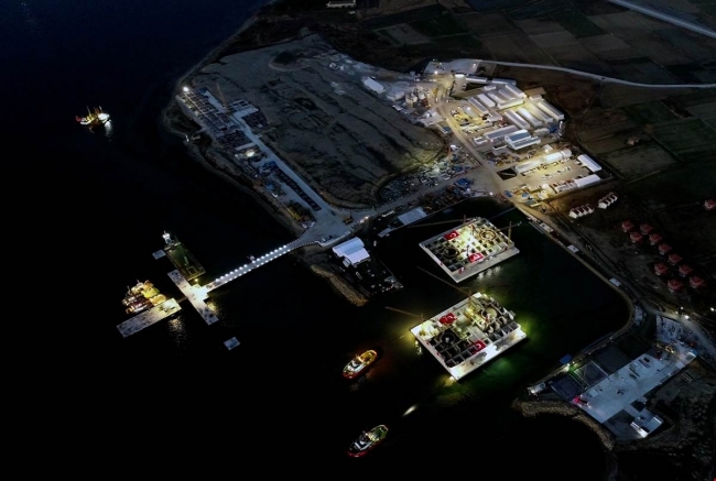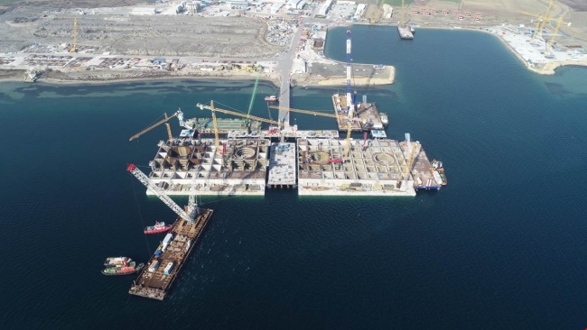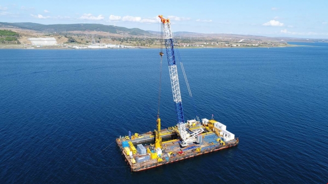 Cumhurbaşkanı Recep Tayyip Erdoğan'ın, 18 Mart 2017'de temelini attığı "1915 Çanakkale Köprüsü"nün denize indirilen Avrupa ve Asya kule keson temellerinin çalışmaları sürdürülüyor.