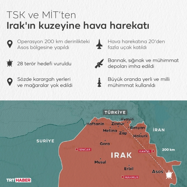Bu kapsamda, 200 kilometre derinlikteki Irak’ın kuzeyi Asos bölgesinde bulunan ve teröristler tarafından kullanılan hedeflere Milli İstihbarat Teşkilatı (MİT) ile koordineli olarak hava harekatı düzenlendi.