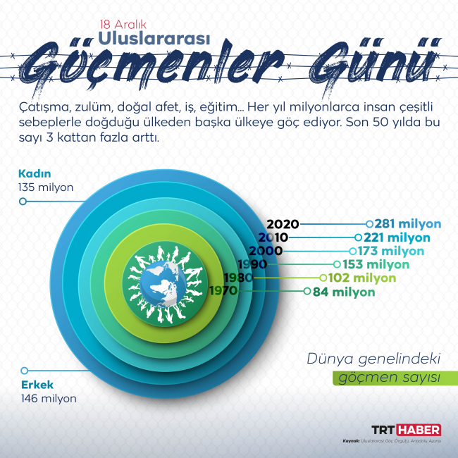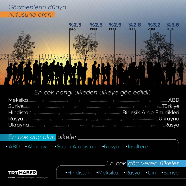 [Grafik: TRT Haber]Raporda, geçen yıl göçmen sayısının 281 milyon kişiyi bulduğu bilgisi verildi. Bu veriler dünya nüfusunun yüzde 3,6'sının göçmen olduğunu gösteriyor.