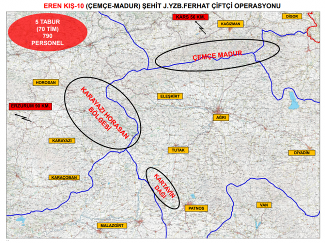 PKK terör örgütünü ülke gündeminden çıkarmak ve bölgede barındığı değerlendirilen teröristleri etkisiz hale getirmek maksadıyla, Ağrı, Kars ve Erzurum illerinde "Eren Kış-10 Çemçe- Madur Şehit Jandarma Yüzbaşı Ferhat Çiftçi Operasyonu" başlatıldı.