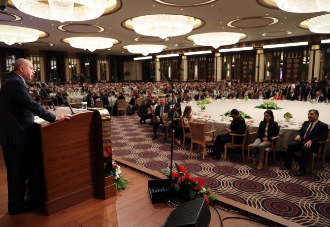 Bu mübarek günlerde yoksullarla, mazlumlarla, gariplerle dayanışmasını artıran, ihtiyaç sahiplerine el uzatan, kimsesizlerin kimsesi, mazlumların hamisi olan milletimizin tüm fertlerine teşekkürlerimi iletiyorum. Şükürler olsun ki muazzam bir ruh ve gönül zenginliğine sahip necip bir milletin evlatlarıyız, mensuplarıyız. Hamdolsun ki ramazan ayının manevi ikliminde yardımlaşmasını artıran, ekmeğini muhtaçlarla paylaşan alicenap bir milletin evlatlarıyız. Ülkemizin dört bir yanında kurulan ramazan sofralarıyla yüreklerimiz bütünleşiyor. Paylaşılan her bir lokma ile vicdanlarımız arınıyor. Ramazanın gelişiyle beraber milletimizin birliği ve kardeşliği de güçleniyor. Rabbim uhuvvetimizi, muhabbetimizi bu salonda vücut bulan şu birlik ve beraberliğimizi daim eylesin.