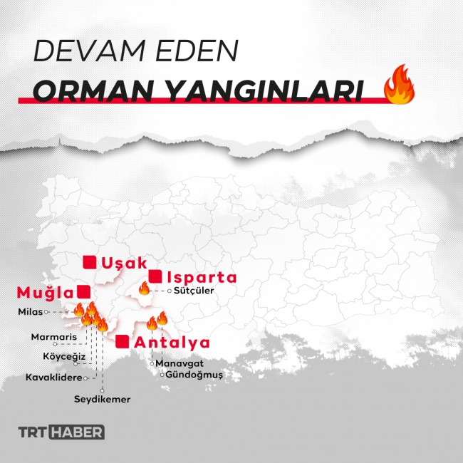 Türkiye'nin Ege ve Akdeniz Bölgeleri'ndeki orman yangınlarıyla mücadelesi 7. gününde devam ediyor. Alevleri sönürmek için başta itfaiye ekipleri olmak üzere büyük bir mücadele veriliyor.
