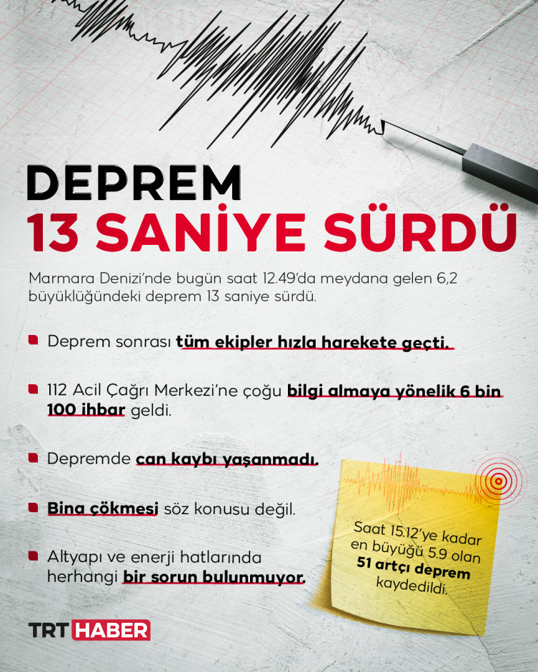 "Marmara Denizi içinde bugün saat 12.49’da 6.2 büyüklüğünde bir deprem meydana geldi. Yerin yaklaşık 7 km derinliğindeki deprem toplam 13 saniye sürdü. Silivri açıklarına 24 km uzaklıkta olan deprem başta İstanbul olmak üzere civar illerde de hissedildi. Saat 15.12’ye kadar en büyüğü 5.9 olan 51 artçı deprem kaydedildi. 112 Acil Çağrı Merkezimize şu ana kadar 6 bin 100 ihbar geldi. Bu ihbarların büyük çoğunluğu bilgi almaya yönelikti. Şükürler olsun şu ana kadar can kaybı ve yaralı vatandaşımız bulunmamaktadır."