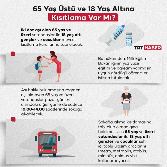 İki doz aşı olan 65 yaş ve üzeri vatandaşlar ile 18 yaş altı kişilere, herkes için uygulanan sokağa çıkma kısıtlamasının dışında ayrıca bir sokağa çıkma kısıtlaması uygulanmayacak.