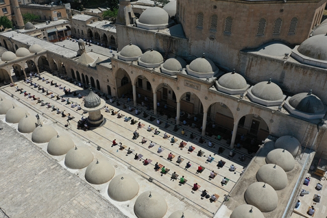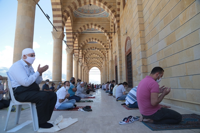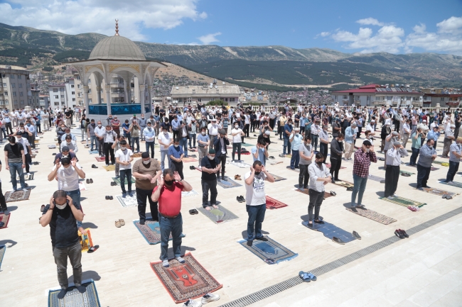 Tedbirlerin üst seviyede tutulduğu açık alan, yeşil saha ve cami bahçelerine seccadeleri ile gelen vatandaşlar, maske takıp sosyal mesafe kuralına uyarak saf tuttu.