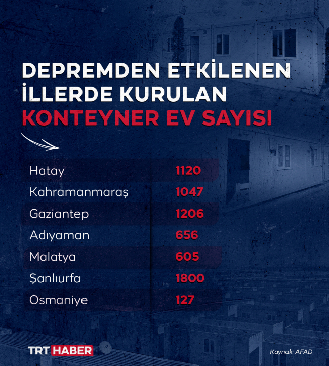 [Grafik: TRT Haber]Bölgede ilk etapta 100 bin konteynerin kurulumuna başlandığı bilgisine yer verilen paylaşımda, depremden etkilenen illerden Hatay'da 1120, Kahramanmaraş'ta 1047, Gaziantep'te 1206, Adıyaman'da 656, Malatya'da 605, Şanlıurfa'da 1800, Osmaniye'de 127 konteyner kurulduğu kaydedildi.