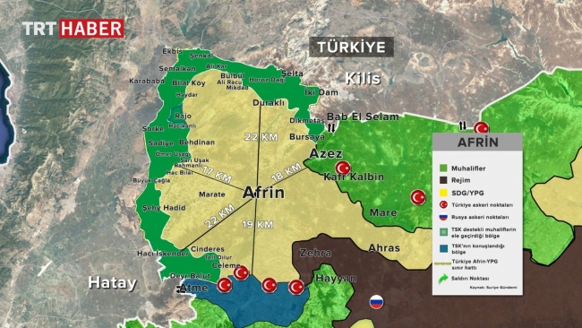 TSK ve operasyonlara destek veren ÖSO güçleri, harekatın başından bu yana YPG/PKK-DEAŞ'ın işgalindeki Afrin'de 2'si belde merkezi, 96'i köy, 6'sı köy altı yerleşim ve 21'i stratejik dağ veya tepe, biri YPG/PKK'ya ait üs olmak üzere 126 noktayı ele geçirdi.
