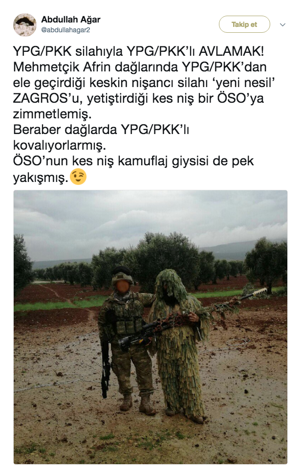 Ağar, sosyal medya hesabından Özgür Suriye Ordusu mensubu bir askerin üzerinde kamuflaj elinde ZAGROS ile çektirdiği bir fotoğrafı "YPG/PKK silahıyla YPG/PKK’lı AVLAMAK" notuyla paylaştı.