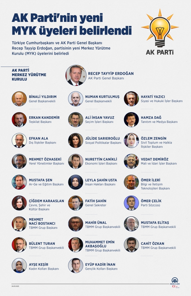AK Parti Sözcüsü Ömer Çelik, partisinin 7'nci Olağan Büyük Kongresi ardından AK Parti Genel Başkanı ve Cumhurbaşkanı Recep Tayyip Erdoğan başkanlığında toplanan Merkez Karar ve Yönetim Kurulu (MKYK) toplantısında MYK üyelerinin belirlendiğini açıkladı.