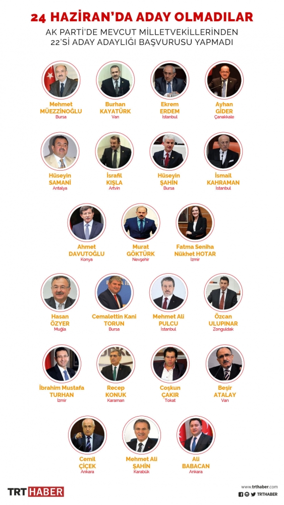 İktidar partisinden 22 kişi ise başvuru yapmadı. Aralarında TBMM Başkanı İsmail Kahraman, eski Başbakan Ahmet Davutoğlu, Mehmet Ali Şahin, eski Sağlık Bakanı Mehmet Müezzinoğlu da var.