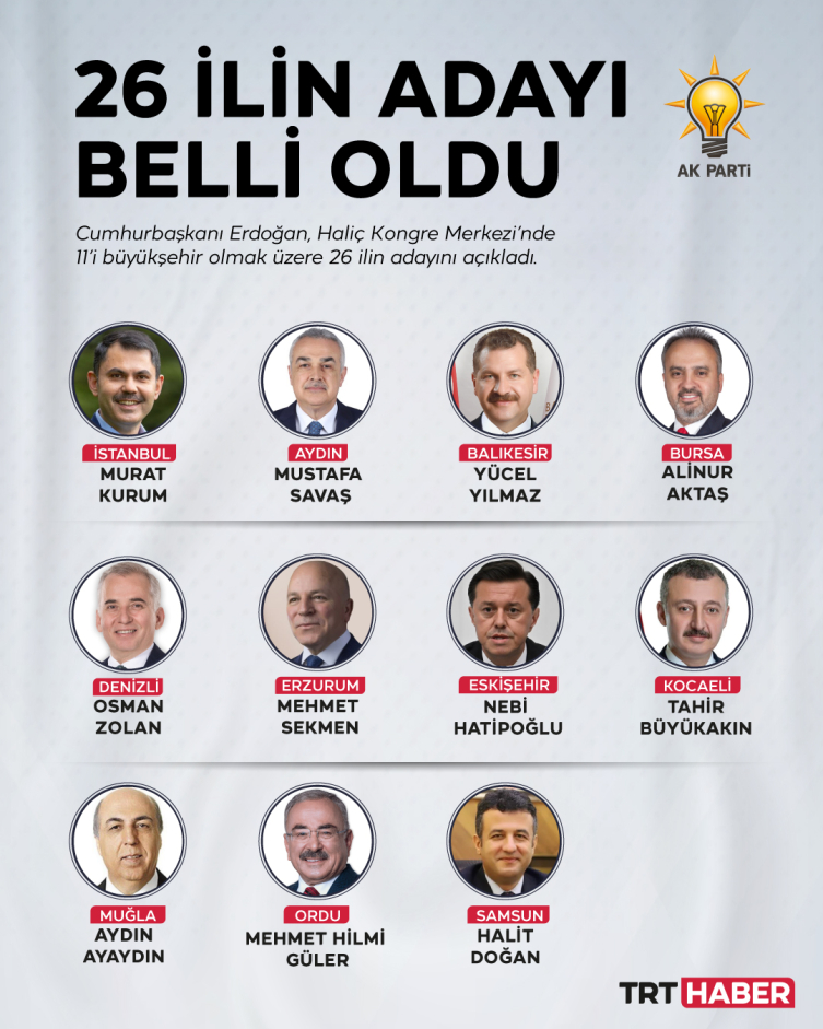 Buna göre; Aydın Büyükşehir Belediye Başkan adayı Mustafa Savaş, Balıkesir Büyükşehir Belediye Başkan adayı Yücel Yılmaz, Bursa Büyükşehir Belediye Başkan adayı Alinur Aktaş, Denizli Büyükşehir Belediye Başkan adayı Osman Zolan, Erzurum Büyükşehir Belediye Başkan adayı Mehmet Sekmen, Eskişehir Büyükşehir Belediye Başkan adayı Nebi Hatipoğlu, İstanbul Büyükşehir Belediye Başkan adayı AK Parti İstanbul Milletvekili Murat Kurum, Kocaeli Büyükşehir Belediye Başkan adayı Tahir Büyükakın, Muğla Büyükşehir Belediye Başkan adayı Aydın Ayaydın, Ordu Büyükşehir Belediye Başkan adayı Mehmet Hilmi Güler ve Samsun Büyükşehir Belediye Başkan adayı Halit Doğan oldu.