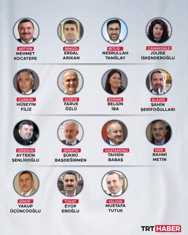 Buna göre; Artvin Belediye Başkan adayı Mehmet Kocatepe, Bingöl Belediye Başkan adayı Erdal Arıkan, Bitlis Belediye Başkan adayı Nesrullah Tanğlay, Çanakkale Belediye Başkan adayı Jülide İskenderoğlu, Çankırı Belediye Başkan adayı Hüseyin Filiz, Düzce Belediye Başkan adayı Faruk Özlü, Edirne Belediye Başkan adayı Belgin İba, Elazığ Belediye Başkan adayı Şahin Şerifoğulları, Giresun Belediye Başkan adayı Aytekin Şenlikoğlu, Isparta Belediye Başkan adayı Şükrü Başdeğirmen, Kastamonu Belediye Başkan adayı Tahsin Babaş, Rize Belediye Başkan adayı Rahmi Metin, Sinop Belediye Başkan adayı Yakup Üçüncüoğlu, Tokat Belediye Başkan adayı Eyüp Eroğlu, Yalova Belediye Başkan adayı Mustafa Tutuk oldu.