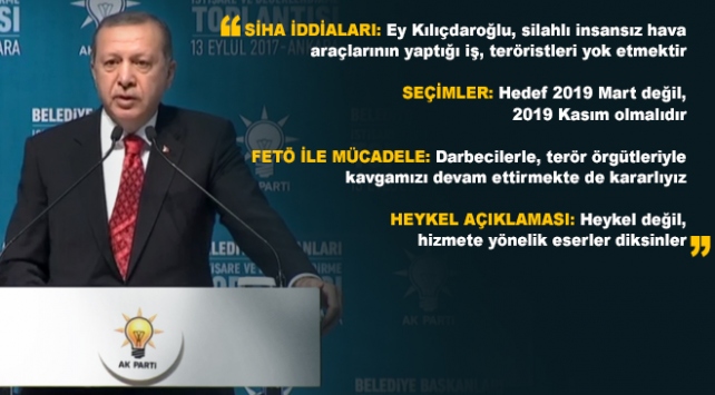 Erdoğan, "Ey Kılıçdaroğlu, ey yanındaki kendini bilmezler, silahlı insansız hava araçlarının yaptığı iş, bu vatana, bu millete ihanet eden teröristleri yok etmektir, bunu böyle biliniz. Sen bir gün başka konuşacaksın, bir gün başka konuşacaksın... Biz sizi biliyoruz zaten, siz gökkuşağı gibisiniz, renkten renge devamlı giriyorsunuz ama bir gün başka, bir gün başka... İşte bu siyasetçiye yakışan bir yürüyüş değildir. Onun için de 9 seçim, 9 mağlubiyet aldın, almaya da devam edeceksin."