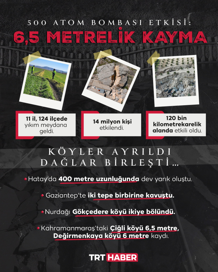 Hatay’da 400 metre uzunluğunda dev yarık oluştu. Gaziantep'de iki tepe birbirine kavuştu. Nurdağı Gökçedere Köyü ikiye bölündü. Kahramanmaraş’taki Çiğli köyü 6 buçuk metre, Değirmenkaya köyü 6 metre kaydı.