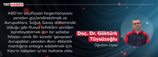 Tüysüzoğlu burada ilginç bir tanımlama yapıyor ve “ABD’nin zayıflayan hegemonyasını yeniden güçlendirebilmek ve Avrupalılara, Soğuk Savaş döneminde olduğu gibi Rusya tehdidini yeniden kanıtlayabilmek için bir sebebe ihtiyacı vardı. Bir süredir ‘gevşeyen’ Avrupalıları yeniden Avro-Atlantik mantığına entegre edebilmek için Kiev’in talepleri iyi bir bahane oldu. Sonrasında yaşanan kriz hepimizin gözü önünde daha farklı bir noktaya büründü.” diyor.