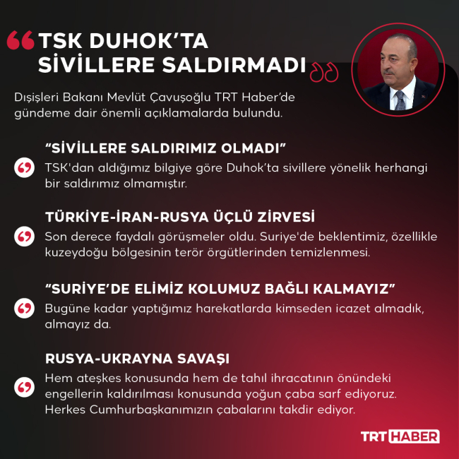 [Irak’taki Dohuk vilayetine saldırı]Dışişleri Bakanı Mevlüt Çavuşoğlu: TSK'dan aldığımız bilgiye göre sivillere yönelik herhangi bir saldırımız olmamıştır.https://t.co/bB0YKZv5DR pic.twitter.com/X8zJmC97xt