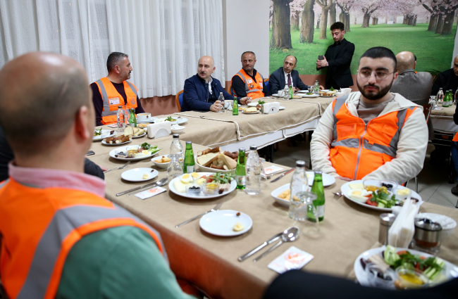 "Hem ramazanın hem sahurun bereketini onlarla birlikte paylaştık. İnşallah hep birlikte bütün Türkiye'nin yine vatanımızın, milletimizin geleceği için, güçlü büyük Türkiye için adım atıyoruz. Ulaşım ihtiyacı vatandaşımızın olmazsa olmazı. Bu ihtiyacı ne kadar konforlu, güvenli ve hızlı yapabilirsek vatandaşımızın hayatını o kadar kolaylaştırmış oluyoruz. O yüzden kutsal bir iş yapıyoruz. Onun sorumluluğu içerisinde bir ekip olarak, 700 bin kişilik büyük bir kadro olarak bakanından en aşağısındaki işçisine kadar özverili bir çalışma var. Bu çalışmalarımız her zaman devam edecek. Biz de onlarla beraber olup inşallah 7/24 hep beraber birlikte çalışacağız inşallah. Vatanımızın, milletimizin selameti ve vatandaşımızın konforu için çalışmaya devam edeceğiz. Bizde mesai bitmiyor."