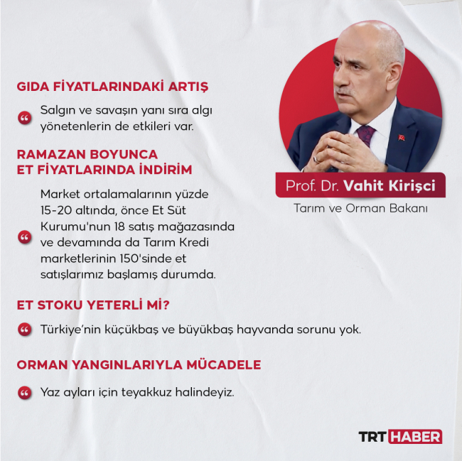 Tarım ve Orman Bakanı Vahit Kirişci, TRT Haber'de gündeme ilişkin soruları yanıtladı.