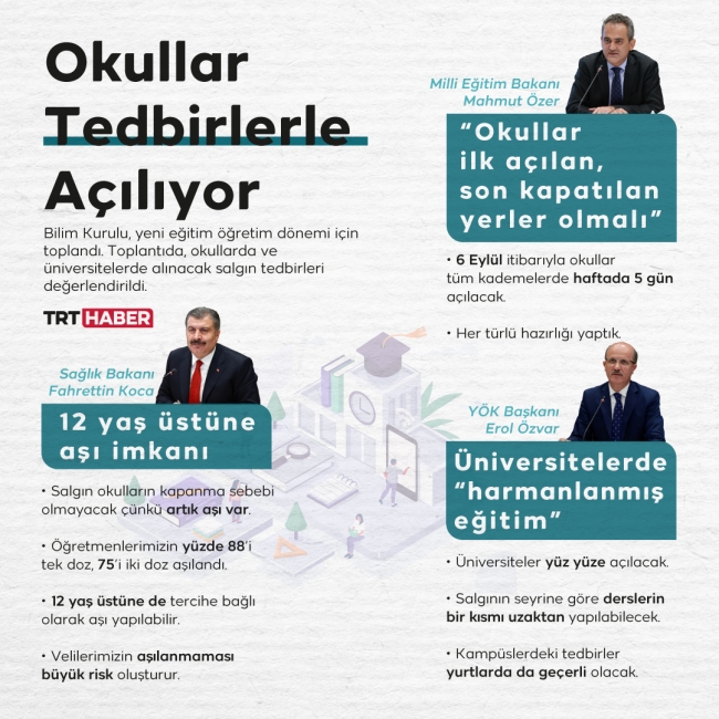 Okulları açık tutmak en önemli ödevimizdir. Tüm gayretimiz yüz yüze eğitim vermek ve bunun sürekliliğini sağlamak. Çocuklara okulda hastalık bulaşır mı sorusu sorulabilir. Bunu düşünüyorsak önce kendimiz tedbirlere uymalıyız. Bu dönemde öğretmenlere, öğrencilere örnek olmalıyız. Yeni dönemde salgın okulların kapanma sebebi olmayacak. Çünkü elimizde artık aşı var. O nedenle vatandaşlarımızın sorumluluklarını bilerek özellikle tedbirlere uymalarını ve bir an önce aşılarını bu sorumluluğun gereği olarak yapmalarını son derece önemsiyoruz. Biz okulları kapatmak değil, en fazla kapatabileceğimiz belki sınıf olabilir, onu bile kapatmak istemiyoruz. O nedenle toplum, vatandaşlarımız, velilerimiz herkes bu noktada lütfen bize destek olsunlar.