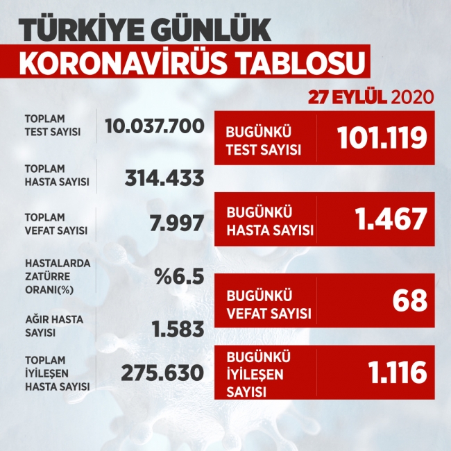 Tabloya göre, son 24 saatte 101 bin 119 kişiye test yapıldı, bin 467 kişide koronavirüs tespit edildi.