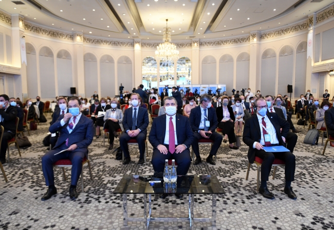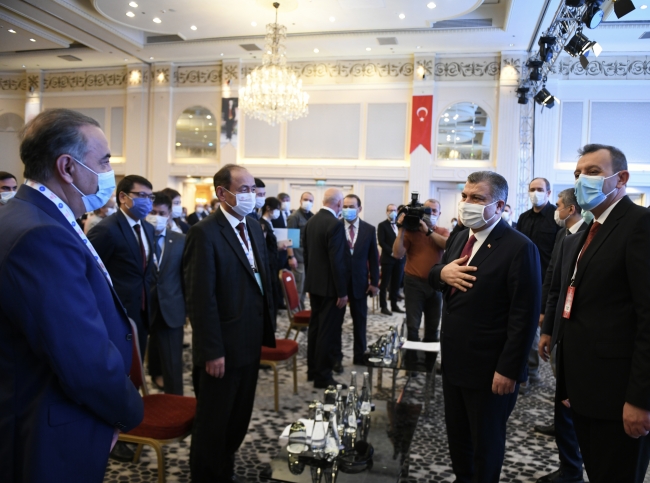 Koca, Türkiye'nin pandemi sürecinde Cumhurbaşkanı Recep Tayyip Erdoğan liderliğinde güçlü sağlık altyapısı ve mesleğine kendisini adamış fedakar sağlık çalışanlarıyla başarılı bir sınav verdiğini dile getirerek, "Bildiğiniz üzere, maske, tulum, eldiven gibi başlıca koruyucu ekipmanlarının yanında kullandığımız bazı ilaçları ve hayati önemi haiz solunum cihazlarının üretimini de yaptık. Ülkemizde kullandığımız gibi, başta dost ve kardeş ülkeler olmak üzere 150'den fazla ülkeye katkı sağlayarak, yardımlaşmanın en güzel örneklerini sergiledik." ifadelerini kullandı.