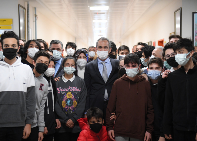 Bakan Özer, öğretmenler odası çıkışında çalan zil sonrası teneffüste öğrencilerle de bir araya geldi. Öğrencilerin sevgi gösterileriyle karşılaşan Özer, onlara derslerinde başarılar diledi.