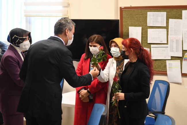 Ziyareti eşi Nebahat Özer'le gerçekleştiren Bakan Özer, öğretmenler odasında bir araya geldiği öğretmenlere tebriklerini iletti ve çiçek hediye etti.