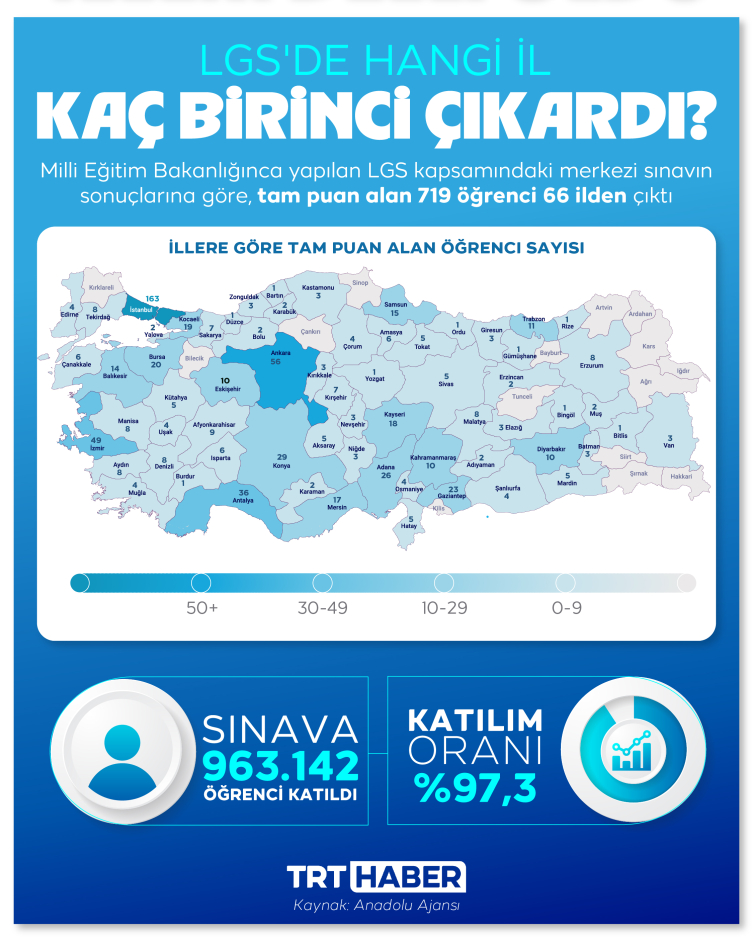 Adana'dan 26, İstanbul'dan 164 öğrencinin tam puan aldığını ifade eden Tekin, "İstanbul'da hem öğrenci popülasyonumuz çok fazla, hem nüfusumuz fazla, orantısal olarak da biraz diğer illere göre İstanbul'un ortalaması fazla. Ama bahsedildiği gibi Anadolu'daki herhangi bir ilde 480 ya da 300 küsür öğrencinin bütün soruları doğru yaptığı bilgisi yanlış." diye konuştu.