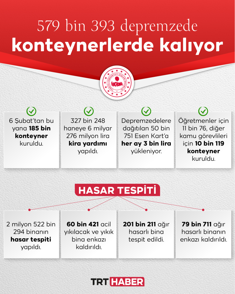 Bakan Yerlikaya, konteynerlerdeki yaşam standartlarını yükseltmek için bir evde olması gereken ihtiyaç malzemelerini temin ettiklerini, bugüne kadar, 327 bin 248 haneye ev sahibi ve kiracı ayrımı yapılmaksızın 6 milyar 276 milyon lira kira yardımı yapıldığını belirtti.