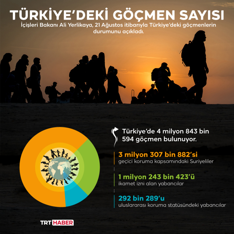 "Ülkemizde 4 milyon 843 bin 594 göçmen bulunuyor. Bunların 1 milyon 243 bin 423'ü ikamet izni alarak ülkemizde yasal bir şekilde yaşayan yabancılardan oluşmakta. Bunun yanında 292 bin 289 uluslararası koruma statüsü sahibi yabancı bulunmakta. Yine ülkemizde geçici koruma kapsamında 3 milyon 307 bin 882 Suriyeli bulunuyor. Ama diğerleri, yani düzensiz göçmenler ya kaçak yollarla ülkemize gelmiş ya da vize alarak ülkemize girmiş ancak yasal kalış süresini ihlal edip vizesiz duruma düşmüş olanlardır."