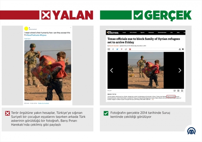 Terör örgütü yanlısı bir hesap, Suriyeli bir çocuğun Suruç'ta eşyalarını taşırken arkada Türk askerinin görüldüğü Eylül 2014 tarihli bir fotoğrafı paylaşarak harekat aleyhine manipülasyon yapmaya çalıştı.