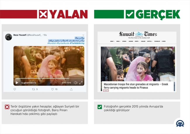 Türkiye'nin güney sınırında oluşturulmaya çalışılan terör koridorunu yok etmek, bölgeye barış ve huzur getirmek amacıyla başlatılan Barış Pınarı Harekatının ilerlemesiyle terör örgütü yanlılarının sosyal medyada, başka olaylarda ve zamanlarda çekilmiş fotoğrafları, videoları, manipülasyon ve dezenformasyon için kullanma çabaları "Suriye'deki çatışmalardan kaçan sivillerin" yer aldığı karelerle devam etti.