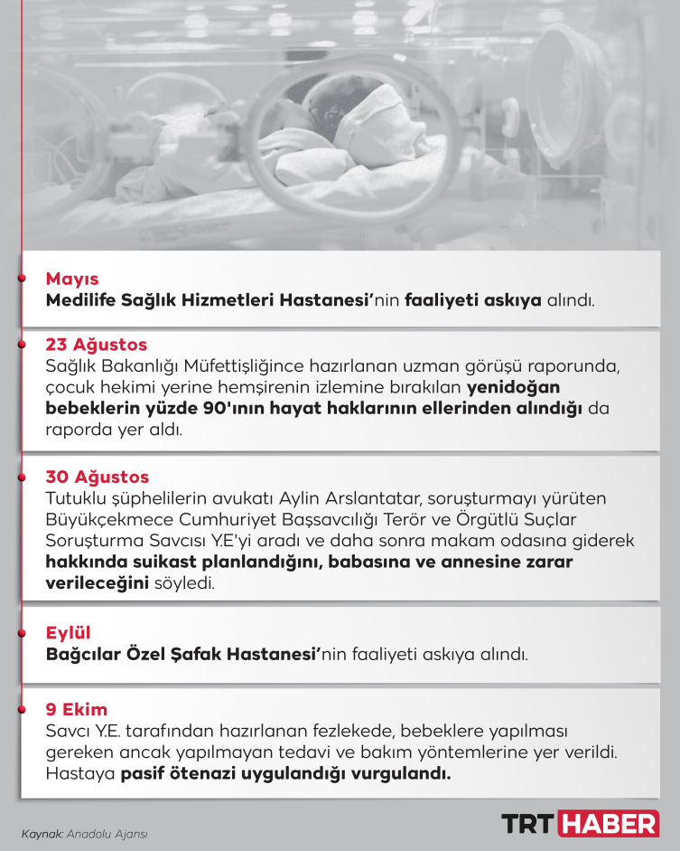 Şüphelilerin, bebek hastalar üzerinden birçok hastane ile anlaşarak uygun ve yeterli olmayan tedavi yöntemleri yüzünden onların hayatlarını kaybetmelerine ya da kalıcı sağlık sorunu ile yaşamalarına neden oldukları belirtilen fezlekede, ayrıca bu tedavi yöntemleri yüzünden SGK'ye yüksek tedavi masraflarını fatura ederek haksız kazanç elde ettikleri belirtildi.