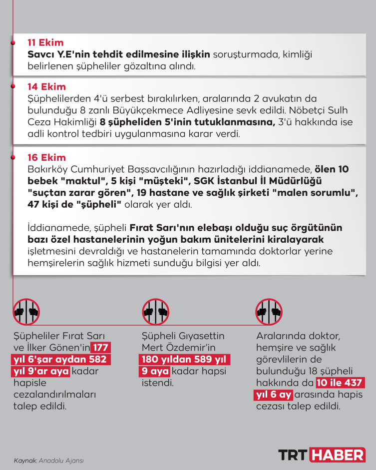 Zanlıların, alınan bebek hastaların hayatın olağan akışına aykırı olacak kadar uzun sürelerde hastanede kalmasını sağladıkları belirtilen fezlekede, şüphelilerin bu şekilde SGK'den yüksek miktarda ödeme alınmasına neden olarak kamu kurumunu zarar uğrattıkları, aynı zamanda uygun tedavi yöntemleriyle tedavi olamayan bebeklerin ölümüne sebebiyet verdikleri belirtildi.