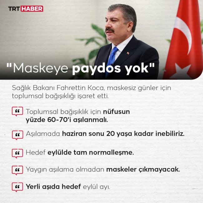 Sağlık Bakanı Fahrettin Koca daha önceki açıklamasında, "Hedef eylül ayında normal hayata geçmek" ifadeleriyle maske, mesafe ve hijyen kurallarına ek olarak maskesiz günler için toplumsal bağışıklığı işaret etmişti.